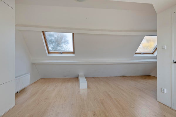 Via een interne trap kom je op de bovenverdieping: een ruime tweede slaapkamer van ongeveer 17,5 m² met karakteristieke schuine muren. Deze etage beschikt eveneens over een eigen badkamer met douche, toilet en wastafel – ideaal voor comfort en privacy.