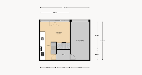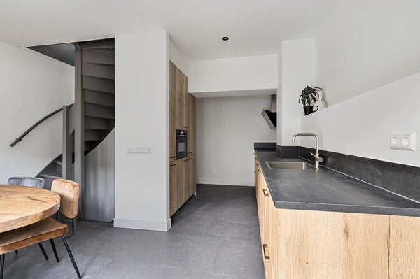 U betreedt de woning via de garage, die uitkomt in de hal met directe toegang tot de moderne open keuken met eetgedeelte. De keuken, uitgevoerd in warme houttinten, is voorzien van inbouwapparatuur (koel-/vriescombinatie, inductiekookplaat met afzuigkap, combimagnetron) en biedt voldoende opbergruimte. De openslaande deuren in de eetkamer zorgen voor veel lichtinval.