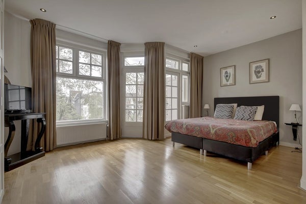 Aan de achterkant van het appartement bevindt zich een ruime slaapkamer met een charmant klein balkon.