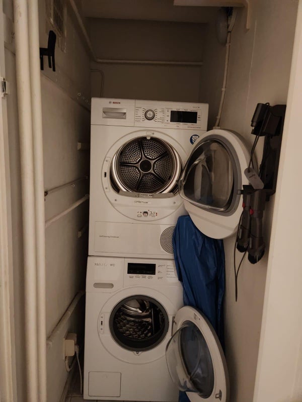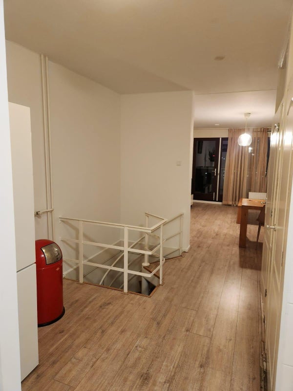 In de hal tref je de wasruimte aan met zowel een wasmachine als droger, het toilet en het trappenhuis naar de ruimte beneden. Op dezelde verdieping vindt je de woonkamer, een eettafel met stoelen, een bankstel, T.V. en T.V. meubel, salontafel en een schuifdeur die toegang geeft tot het balkon met een mooi uitzicht op het Sloterplas.