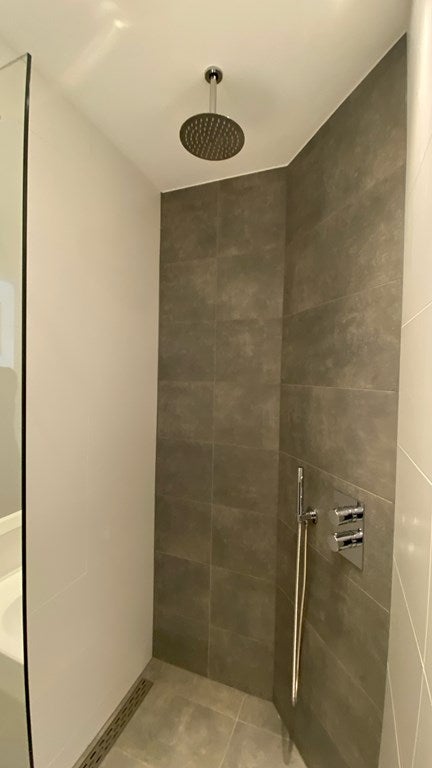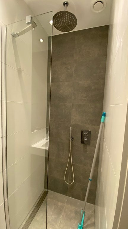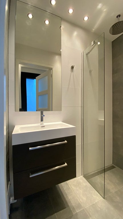 Voorkant, woonkamer met open keuken met alle inbouwapparatuur, grote ramen die veel natuurlijk licht in de woning brengen. Via de hal naar achteren, badkamer met douche, wastafel en toilet. Slaapkamer ruim genoeg voor een tweepersoonsbed en ingebouwde kasten. Aan de achterkant, tweede slaapkamer met ensuite badkamer met douche, wastafel en tweede toilet. Separate ruimte voor de was.