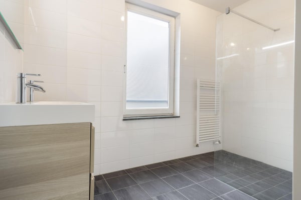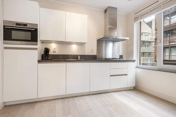 Grenzend aan de woonkamer vindt u de strak ingerichte keuken voorzien van alle benodigde inbouw apparatuur zoals o.a. een vaatwasser, koel-/vries combinatie, oven-magnetron combinatie, 4-pits gaskookplaat en afzuigkap. Aan de achterzijde van de woning vindt u een ruime slaapkamer en de badkamer voorzien van wastafel en inloopdouche.