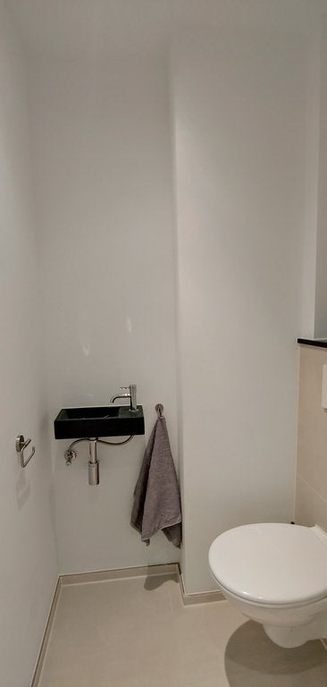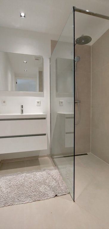 De badkamer is recent gerenoveerd en uitgerust met een douche met glazen afscheiding, designradiator en een wastafel met daaronder veel opbergruimte. Het toilet is afzonderlijk.