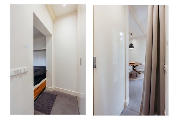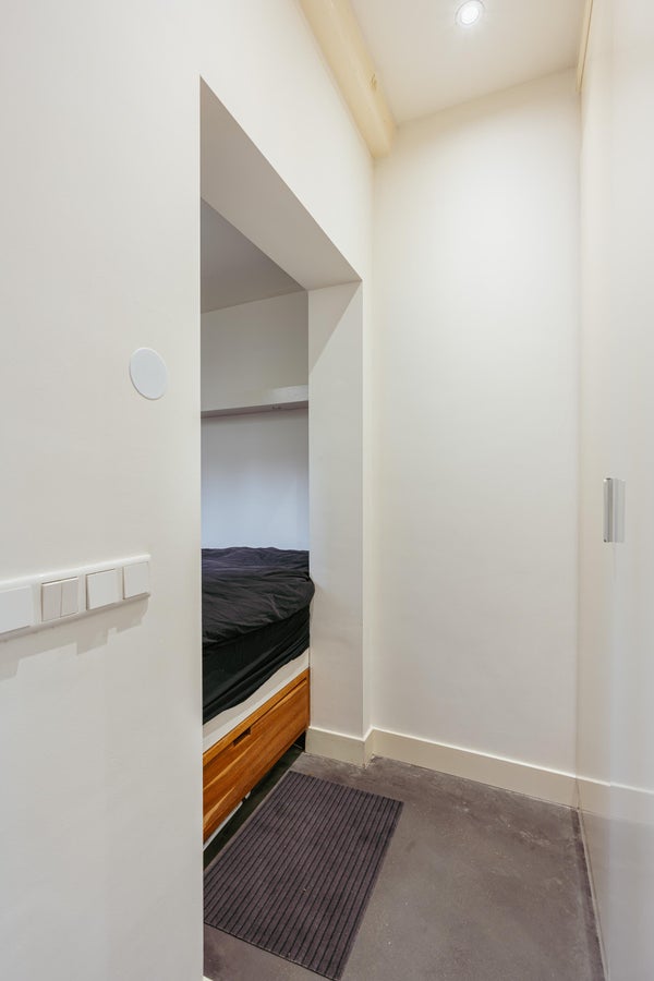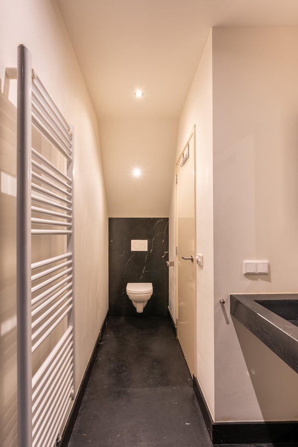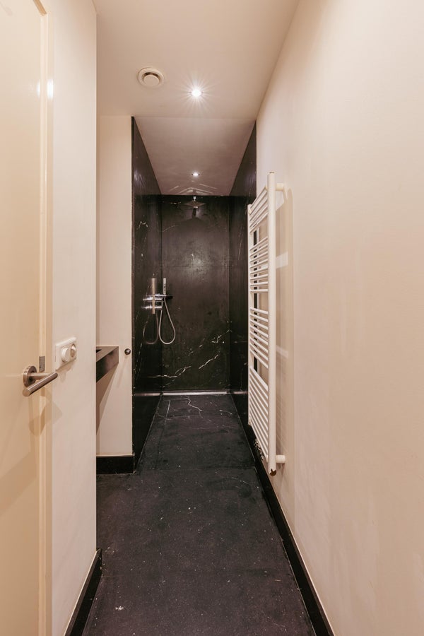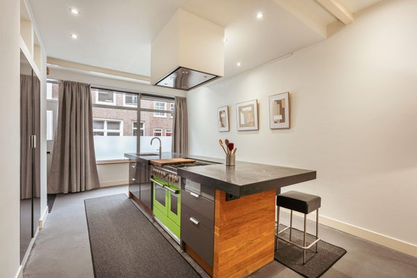 De open woonkeuken is het hart van de woning en uitgevoerd met een groot kookeiland voorzien van een natuurstenen werkblad. De keuken beschikt over diverse inbouwapparatuur zoals een 6-pits gasfornuis met oven, Quooker, vaatwasser, koel-/vriescombinatie en veel kastruimte. Aan het eiland bevindt zich tevens een gezellige bar met barkrukken, ideaal voor ontbijt of een borrel met vrienden. Aan de achterzijde bevindt zich de slaapruimte, die middels een slimme indeling als bednis is weggewerkt en zorgt voor een optimaal gebruik van de ruimte. De badkamer is uitgevoerd in luxe blauwhardsteen en beschikt over een inloopdouche met regendouche, modern wastafelmeubel, toilet en handdoekradiator. De woning is volledig voorzien van een strakke gietvloer, inbouwverlichting en moderne afwerking.