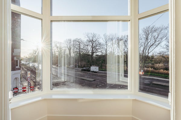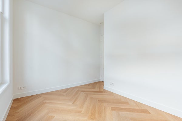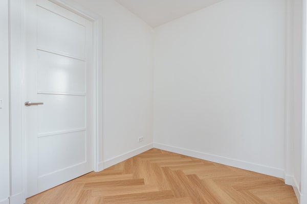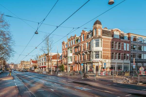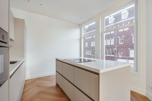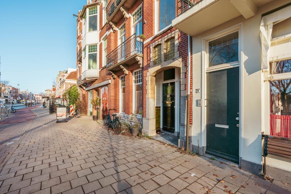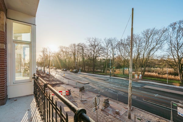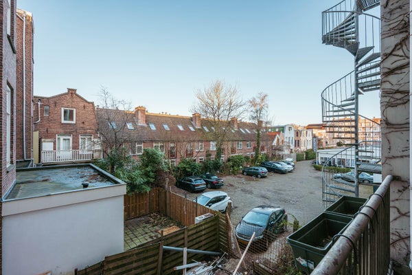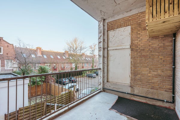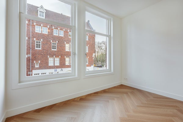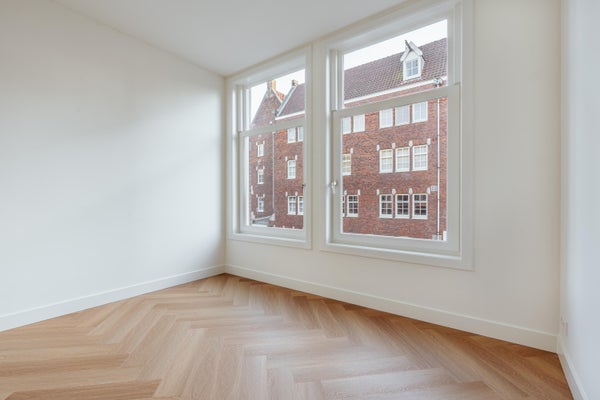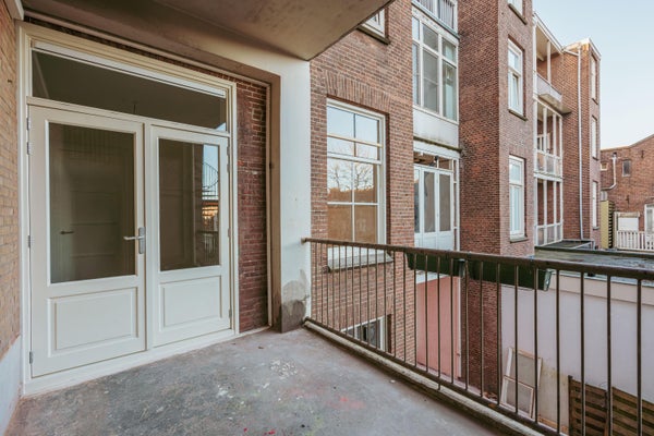 Via de entree op de eerste verdieping betreed je de woning via de centrale hal die toegang biedt tot alle vertrekken. Aan de voorzijde bevindt zich de ruime en lichte woonkamer, met een karakteristieke erker en grote raampartijen. De kamer heeft een open indeling en biedt via dubbele deuren toegang tot het balkon aan de straatzijde. Aangrenzend ligt de keuken, welke is opgesteld in een praktische, langgerekte indeling en beschikt over de benodigde aansluitingen en werkruimte. Aan de rustige achterzijde van het appartement bevinden zich twee ruime slaapkamers. De grootste slaapkamer ligt rechts en biedt voldoende plek voor een groot bed en kastruimte. De tweede slaapkamer ligt links en beschikt over openslaande deuren naar het balkon, met uitzicht op de binnentuinen. De badkamer is centraal gelegen en voorzien van een douche en wastafel. Daarnaast is er een separaat toilet en een CV-ruimte in de hal. Een extra kast biedt plek voor de meterkast en opbergruimte. Kortom: een licht, ruim ingedeeld appartement met twee goede slaapkamers en twee balkons, gelegen op een aantrekkelijke locatie.