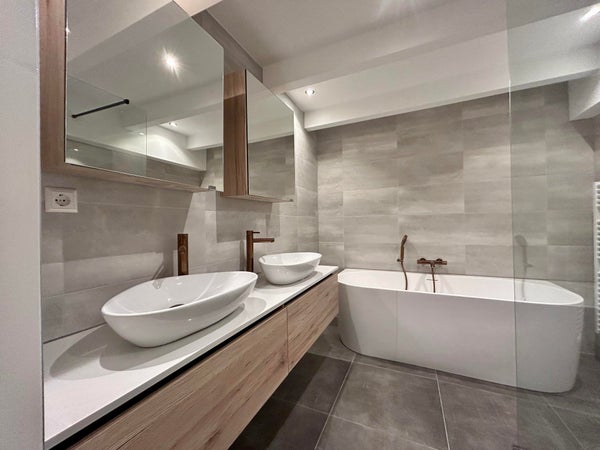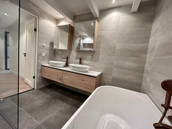 * Badkamer voorzien van dubbele wastafel, ligbad en inloopdouche