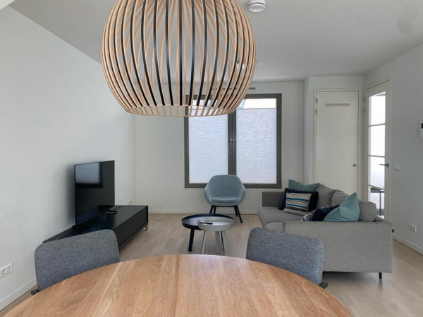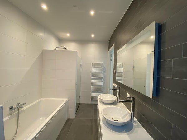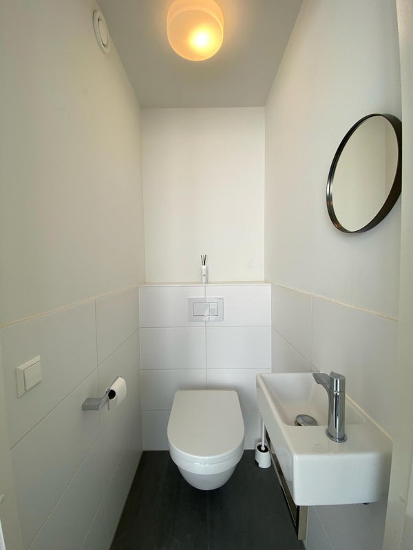 Het appartement opent met een ruime hal, voorzien van meterkast, een aparte berging met wasmachineaansluiting, modern gastentoilet en toegang tot de royale woonkamer met luxe open keuken.