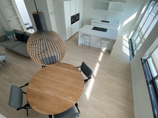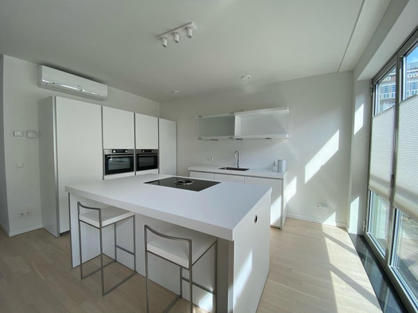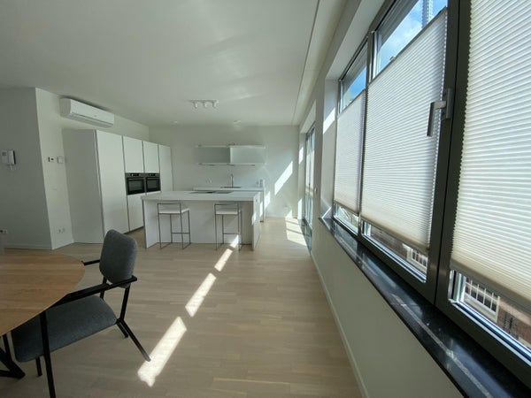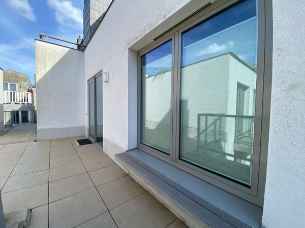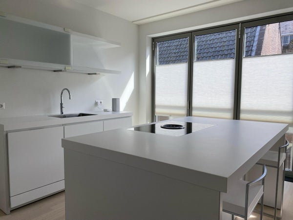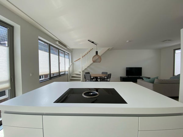 De woonkamer/keuken beschikt over een indrukwekkende harmonicapui over de volledige breedte, die volledig geopend kan worden, waardoor er als het ware een groot Frans balkon ontstaat – ideaal voor zomerse dagen en extra gevoel van ruimte.