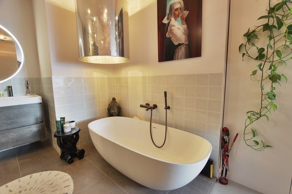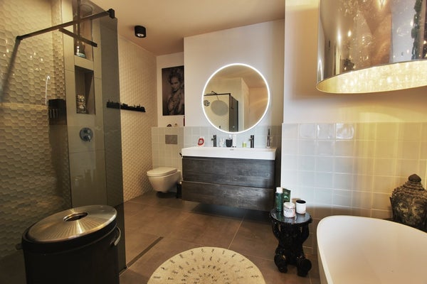 Hoofdslaapkamer met tweepersoonsbed en een eigen badkamer en-suite met inloopdouche, dubbele wastafel, bad en een 2e toilet.