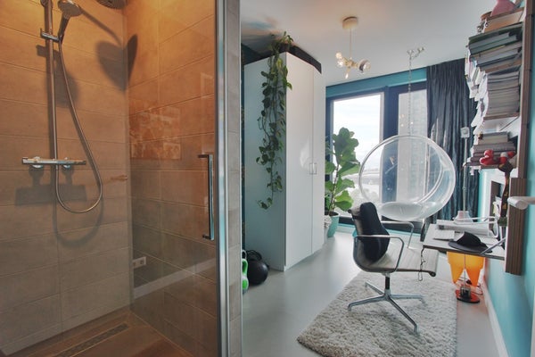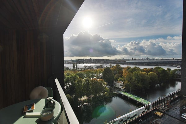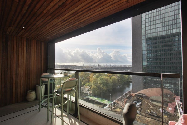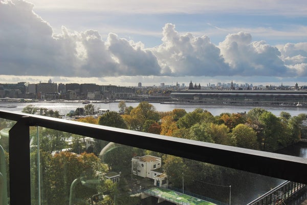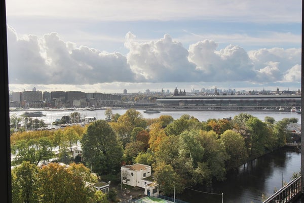 Licht en fris wonen open keuken-eetkamer met ruime terras gelegen op het zuidwesten met een uitzonderlijk uitzicht over het centrum van Amsterdam.