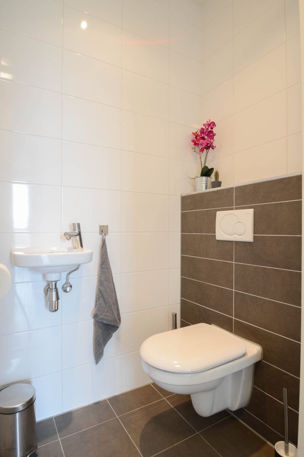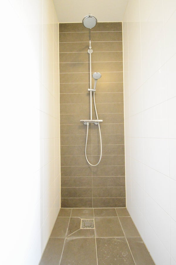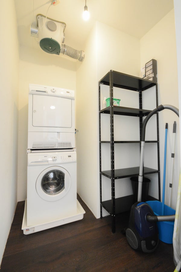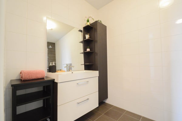 Vanuit de hal heb je toegang tot een separaat toilet, een berging met daarin de wasmachine en droger en de badkamer met een aparte douche en groot badkamermeubel.