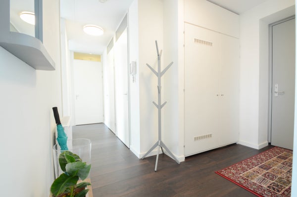 De entree is op de begane grond in de centrale hal. De lift brengt je naar de twaalfde verdieping.