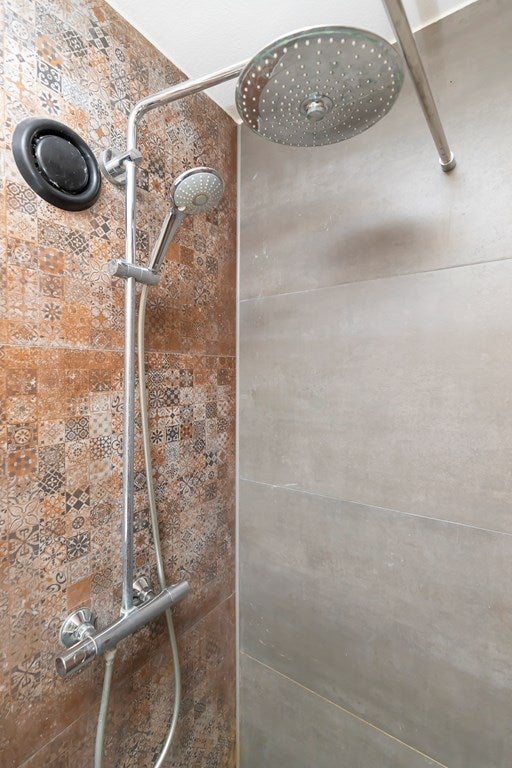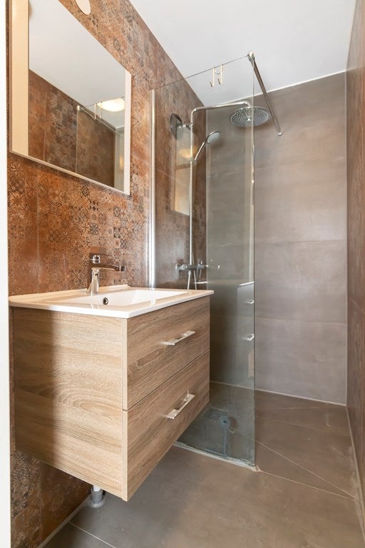 Badkamer met douche, wastafel en aansluiting voor wasmachine