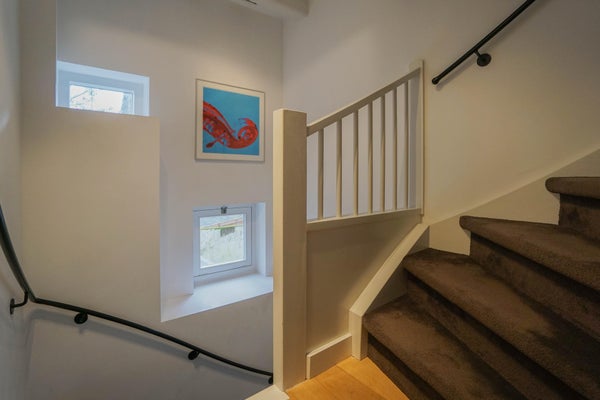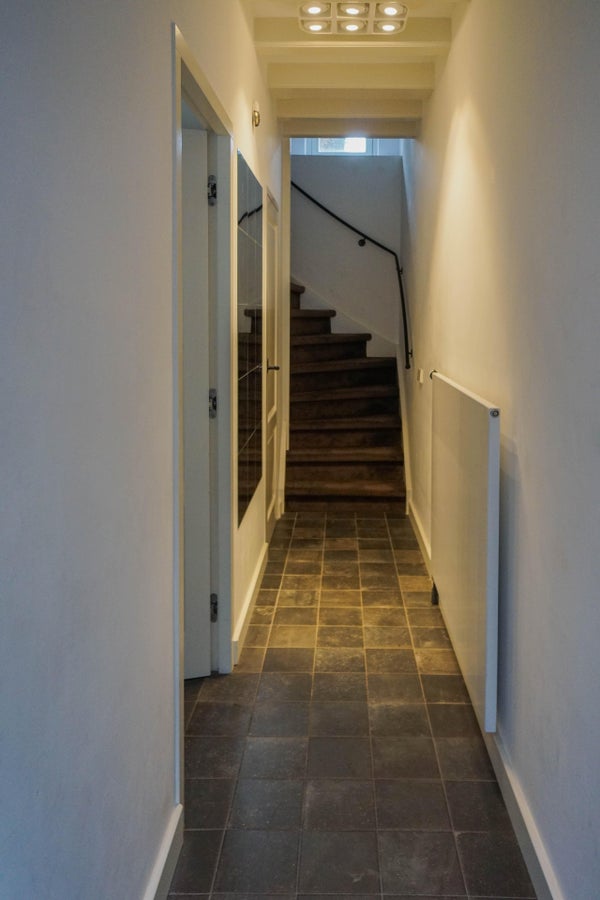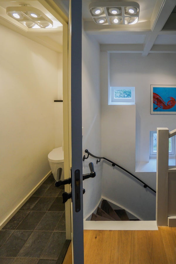Eerste verdieping: Overloop, aparte toiletruimte en een ruime en lichte woonkamer. Er is een roeiapparaat in de alcove als je je voelt als Kevin Spacey in HOC.