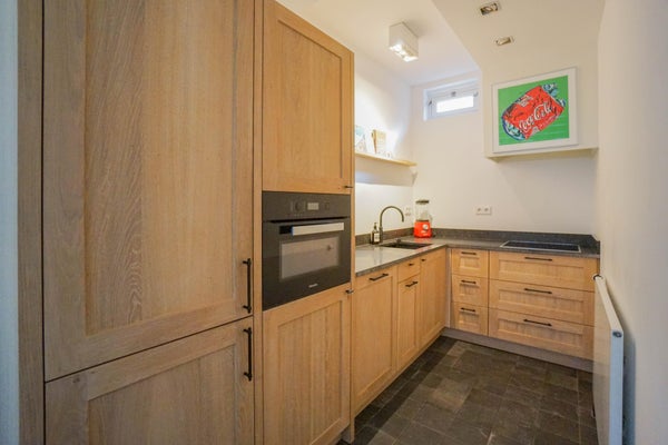 Begane grond: Privé-ingang op de begane grond met een gang, wasruimte en een eet- en kookgedeelte met een moderne, volledig uitgeruste keuken.
