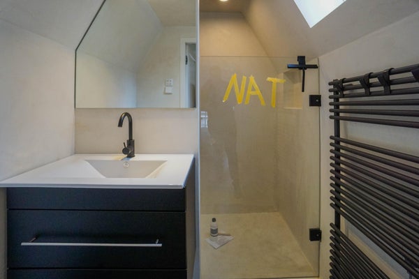 Tweede verdieping: Overloop, goed formaat slaapkamer met veel kastruimte en een badkamer met een wastafel en douche.