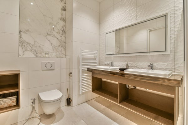 Badkamer met wandhangend toilet, dubbele design wastafel en inloopdouche
