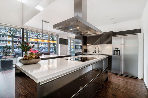- Begane grond: entree met hal en toilet, luxe open keuken met kookeiland en hoogwaardige inbouwapparatuur (Miele/Atag), ruime bijkeuken met extra koel/vriescombinatie, wasmachine- en drogeraansluiting. Vanuit de hal directe toegang tot de parkeergarage.
