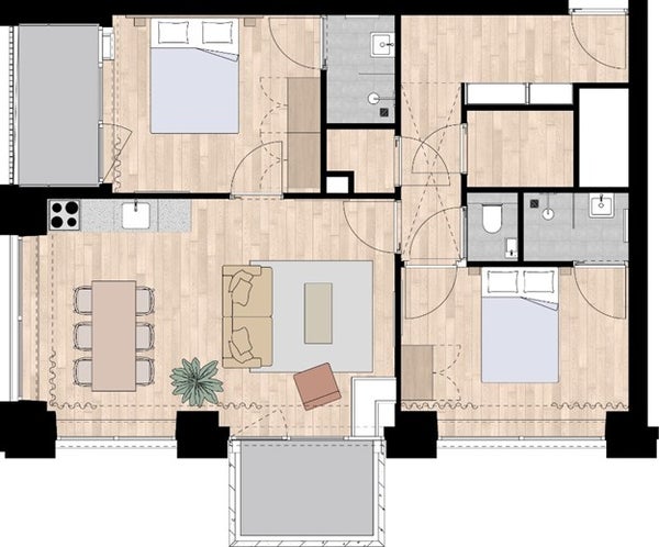 Elke woning beschikt over een moderne keuken met inbouwapparatuur, een stijlvolle badkamer en grote ramen voor veel natuurlijk licht. Geniet van je eigen balkon, loggia of terras met uitzicht over de stad en het omliggende landschap.