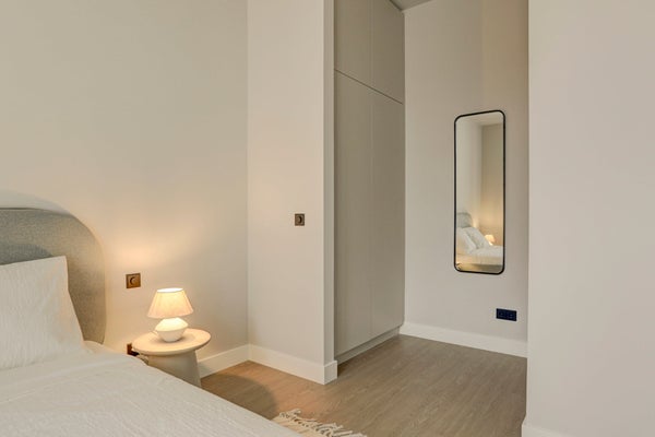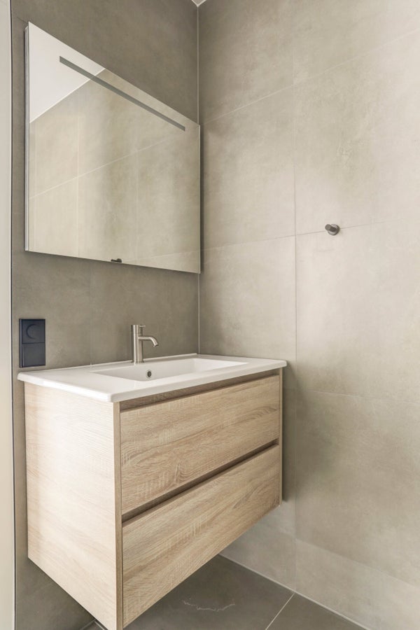 Aan de achterkant van het appartement vind je twee slaapkamers (één hoofdslaapkamer en één gasten slaapkamer) en vele inbouwkasten. In het midden van de hal vind je de nieuwe moderne badkamer met een toilet, wastafel en douche.