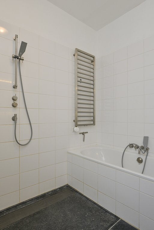 De moderne badkamer is voorzien van een ligbad, separate douche, wastafel en handdoekradiator. Deze badkamer is zowel vanuit de hal als de slaapkamer te bereiken.