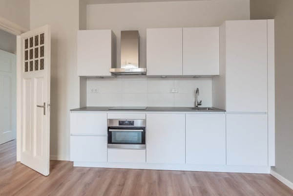 INDELINGVia het brede trappenhuis bereikt u de entree op de eerste verdieping. De hal is ruim en biedt toegang tot alle ruimtes. Aan de achterzijde bevinden zich de master slaapkamer met toegang tot het zonnige balkon (12m2) gelegen op het zuiden, de badkamer (met ligbad) en een tweede (slaap)kamer. De ruime en lichte woonkamer met open keuken (voorzien van alle moderne apparatuur) bevindt zich aan de voorzijde van het appartement, vanuit de woonkamer is toegang tot het tweede balkon aan de straatzijde. De derde ruime slaapkamer bevindt zich ook aan de voorzijde van het appartement.