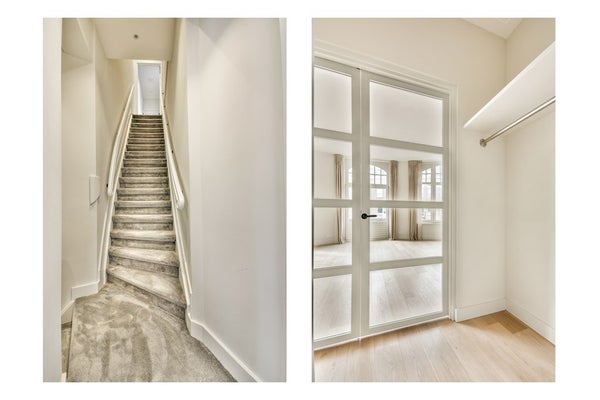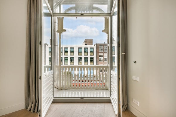 De ingang van het appartement bevindt zich op de tweede verdieping. Je komt binnen in de zeer ruime hal waar je een garderobe en een stijlvolle glazen en stalen deur vindt die leidt naar de woonkamer van 45M², die veel natuurlijk licht heeft dankzij de grote ramen en hoge plafonds (3.10 Meter). Het appartement heeft drie kleine balkons aan de voorkant door de hoeklocatie. De keuken is uitgerust met inbouwapparatuur en heeft zelfs een Quooker. Aan de achterkant van het appartement zijn er twee slaapkamers. De master bedroom (12M²) heeft directe toegang tot het balkon en een opslagruimte. De kleinere slaapkamer (9M²) is perfect voor een thuiskantoor/kleedkamer, enz. en heeft ook directe toegang tot het balkon. De badkamer heeft een aparte badkuip, inloopdouche en dubbele wastafel met design spiegel. In de hal is er een apart toilet en een ruimte met de aansluiting voor de wasmachine en droger.