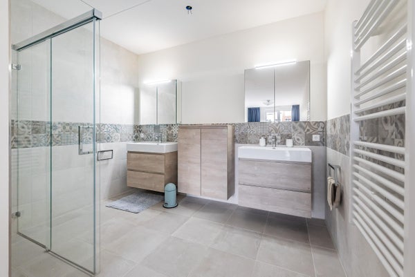 Aan de achterzijde bevinden zich 3 slaapkamers waarbij voor 2 slaapkamers een extra badkamer is gesitueerd die vanuit beide kamers makkelijk te bereiken is. De masterbedroom is gekoppeld aan een grote badkamer met een dubbele wastafelmeubel en een douche. Vanuit de douche stap je zo je bed in.
