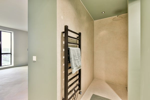 Het appartement beschikt over een tweede badkamer met luxe inloopdouche en een dubbele wastafel. Op de hal ligt er ook een apart toilet. En er is een ruime berging waar ook de wasmachineaansluiting is te vinden. Door het gehele appartement ligt een fraaie visgraat vloer een met rustieke hout uitstraling. Alle vloeren binnen het appartement zijn voorzien van vloerverwarming.