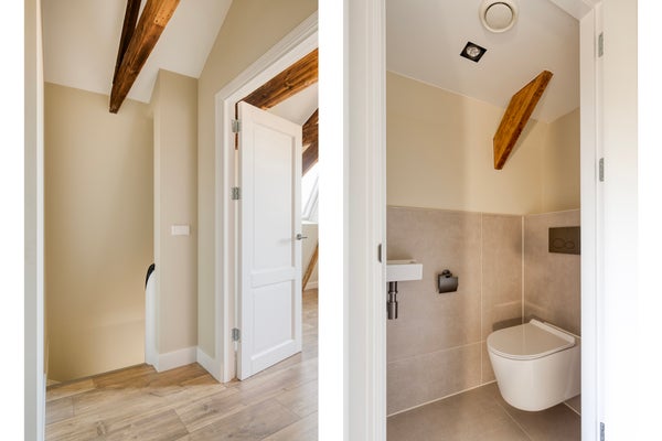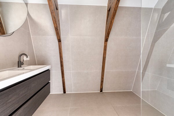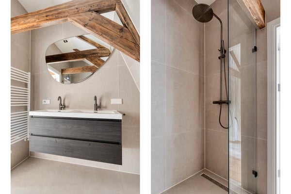 Op de vierde verdieping liggen de twee ruime slaapkamers. De mooie houten balken geven deze etage extra karakter en een warme uitstraling. De moderne badkamer is voorzien van een luxe regendouche, dubbele wastafel met meubel, handdoekradiator en een tweede separaat toilet.