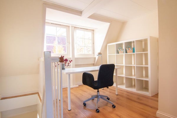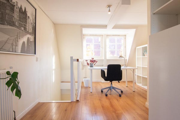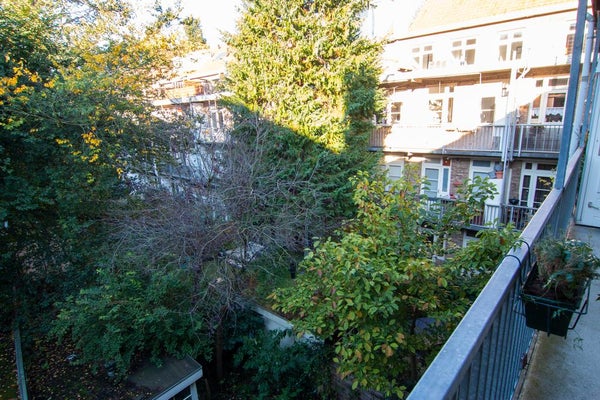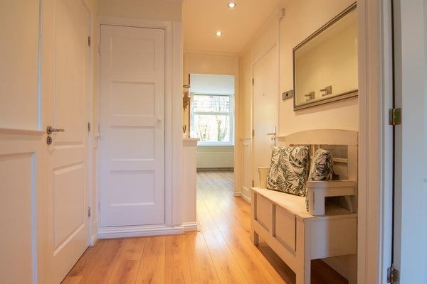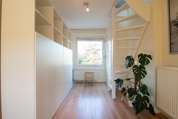 Gemeenschappelijke entree, trap naar de tweede verdieping, hal met kapstok, volledig uitgeruste keuken met: vaatwasser, oven, magnetron, koelkast en vriezer, toegang tot het zonnige balkon, master bedroom en tweede kleinere slaapkamer aan de rustige achterzijde van het appartement, badkamer (2021) met wastafel, toilet en bad, lichte woonkamer met eet- en zithoek aan de voorkant, trap naar de derde verdieping: open studieruimte, toegang tot het wasgedeelte en het geweldige dakterras, steile trap naar de bovenste verdieping met open gasten/d derde slaapkamer