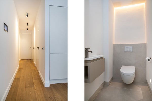Direct na het betreden van het appartement, vindt u kleine trappen die leiden naar de kelder of het lichte eetgedeelte, dat verbonden is met een ruime, volledig uitgeruste open keuken. De keuken heeft een vaatwasser, koelkast & vriezer, een quooker (voor direct kokend water), een Nespresso machine en een inductiekookplaat met een ingebouwd afzuigsysteem.