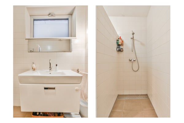 De badkamer is uitgerust met een inloopdouche en een wastafel met meubel. In de hal bevindt zich tevens een separaat toilet.
