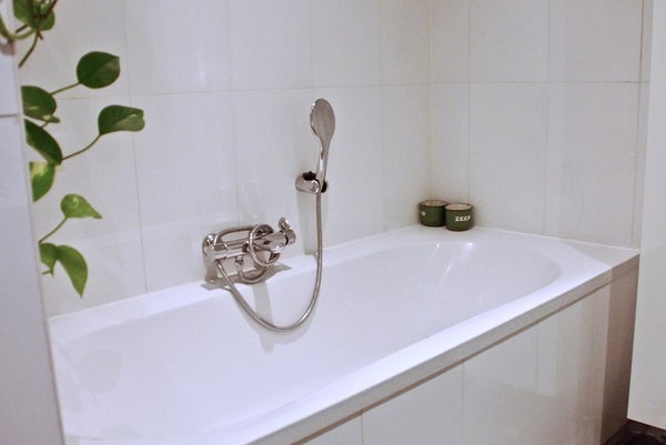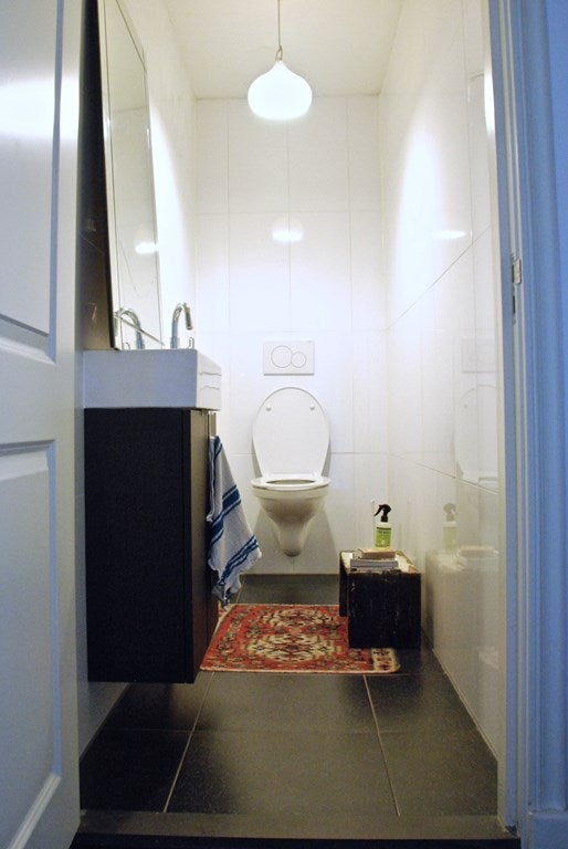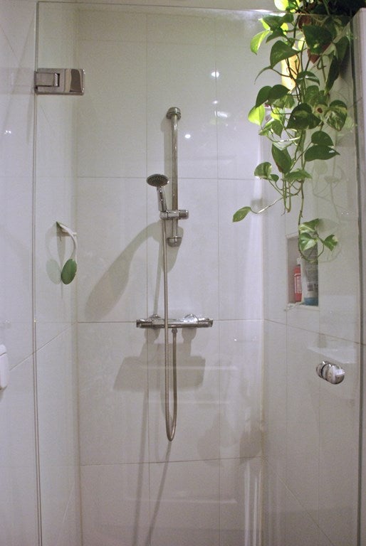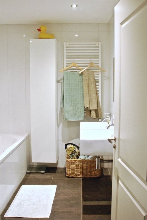 De badkamer is uitgerust met een inloopdouche, ligbad en dubbele wastafel. Daarnaast is er nog een separaat toilet in de gang.