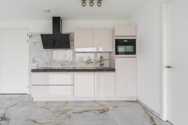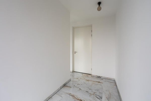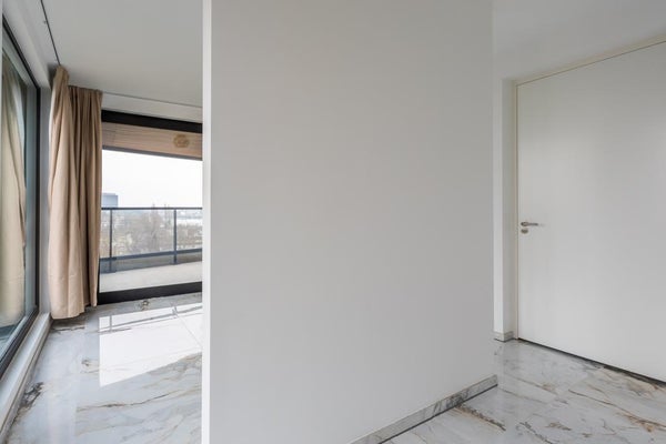 Bij binnenkomst op de zevende verdieping betreed je een hal met toegang tot een separaat toilet, een wasruimte en een ruime berging. Dubbele openslaande deuren geven toegang tot de grote woonkamer met moderne open keuken en het aangrenzende balkon van circa 10 m².