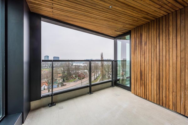 Het balkon is een verlengstuk van de leefruimte en creëert een uniek binnen-buiten gevoel, perfect om te genieten van het uitzicht over het IJ en de stad.