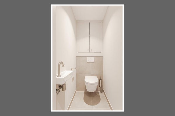 In de hal bevinden zich een separaat toilet met fontein en een aparte kast met wasmachine en droger.