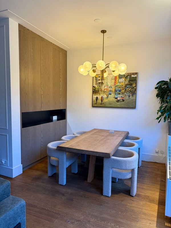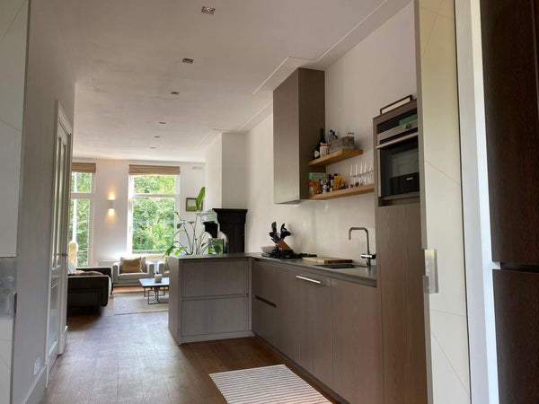 Voorin vindt u de uitnodigende woonkamer en open keuken, beide met direct uitzicht op het Vondelpark. Vanaf hier heeft u toegang tot het eerste balkon — een perfecte plek om te ontspannen en van het groen te genieten.