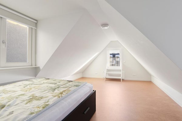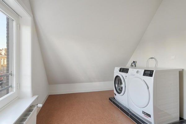 4e etage: slaapkamer, wasruimte, dakterras met uitzicht op de Westertoren.