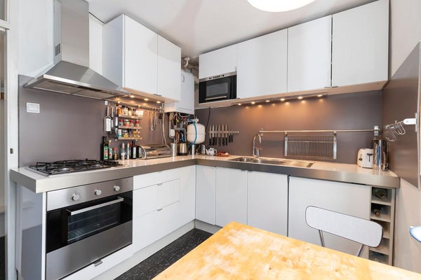 Aan de achterzijde van het appartement vind je de volledig uitgeruste keuken, compleet met een oven, magnetron, koelkast, vriezer en kookplaat. Een gezellige eetruimte stelt je in staat om te ontbijten met uitzicht op een goed onderhouden binnenplaats.