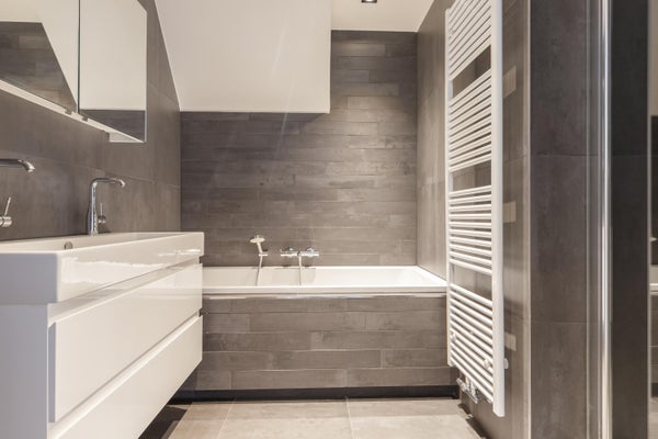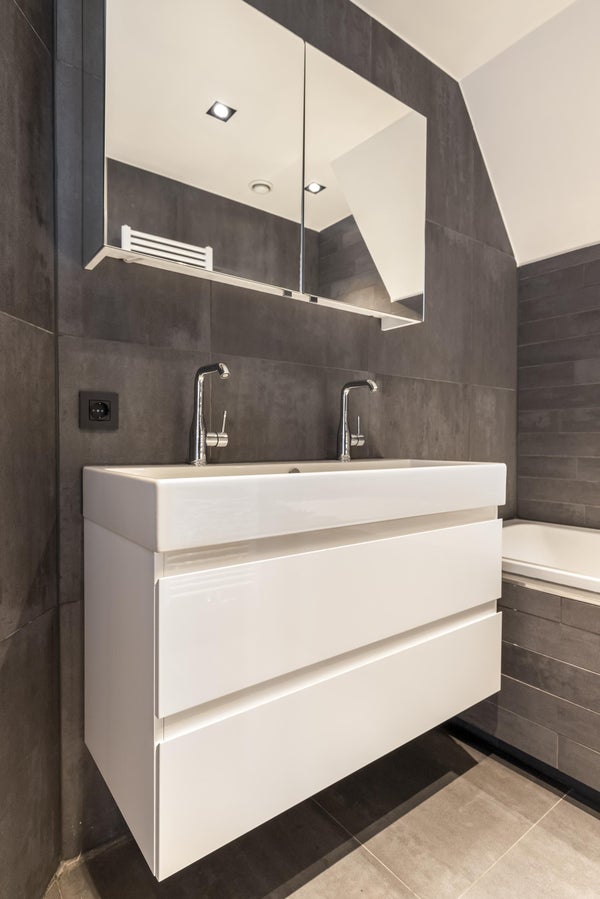 Deze woning beschikt over een luxe afgewerkte badkamer, voorzien van een modern design en hoogwaardige materialen. De donkere wand- en vloertegels geven de ruimte een luxe en warme uitstraling. Er is een dubbele wastafel met strak vormgegeven meubel, een ruime inloopdouche met regendouche én een heerlijk ligbad. Daarnaast is er een separaat toilet aanwezig, wat extra comfort en privacy biedt. Een badkamer waarin je elke dag kunt genieten!