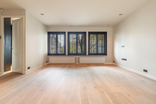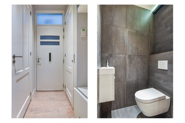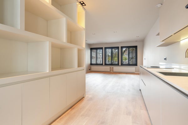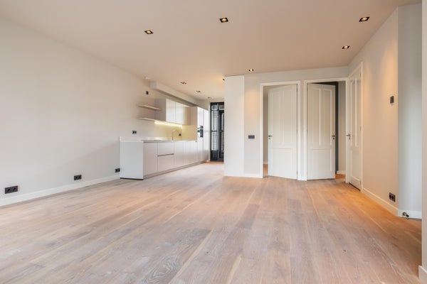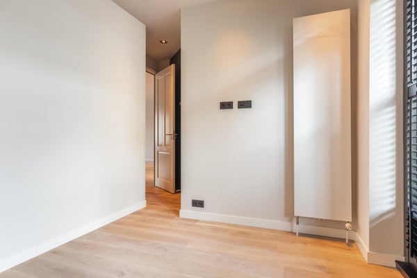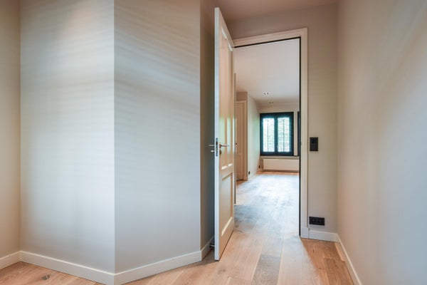Via de authentieke entree bereik je het appartement. Je komt binnen in een strak afgewerkte hal met toegang tot het toilet en de overige vertrekken. De woning is volledig gerenoveerd en afgewerkt met hoogwaardige materialen. De lichte houten vloer, glad gestuukte wanden en moderne kleurstelling geven het appartement een rustige, stijlvolle uitstraling.