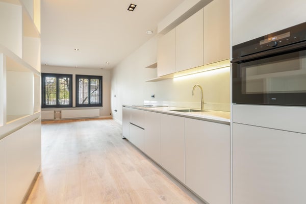De moderne keuken is voorzien van een strak werkblad, inductiekookplaat met geïntegreerde afzuiging, vaatwasser, oven, koelkast en vriezer. De slimme indeling zorgt voor veel opbergruimte en geïntegreerde verlichting.