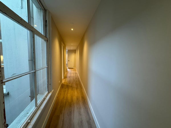 De lange gang en zichtlijnen door de woning zorgen voor een ruimtelijk gevoel. Daarnaast is er praktische bergruimte aanwezig, onder andere achter de knieschotten en in vaste kasten.