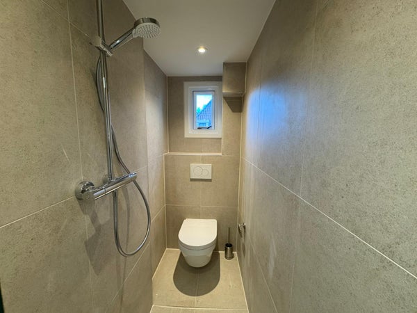 De badkamer is modern afgewerkt en voorzien van een inloopdouche en wastafelmeubel en toilet.