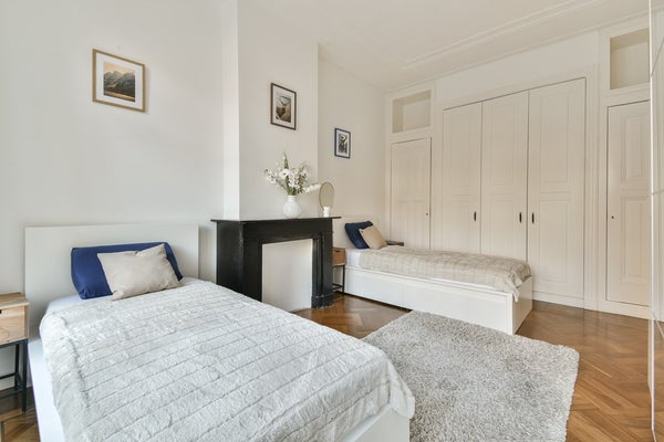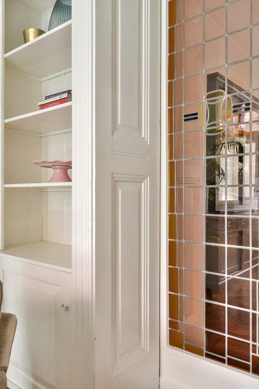 Drie slaapkamers, waarvan twee met ingebouwde kasten en klassieke elementen zoals glas-in-lood, marmeren schouwen en een Frans balkon.