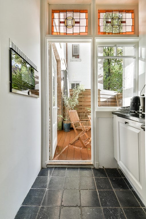 Eigen entree met glas-in-loodramen. Centrale hal met trap naar de kelder en eerste verdieping, en een separaat toilet met fonteintje.