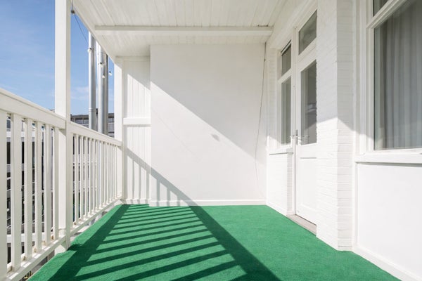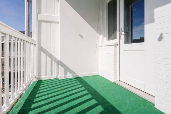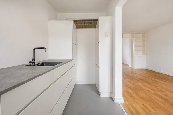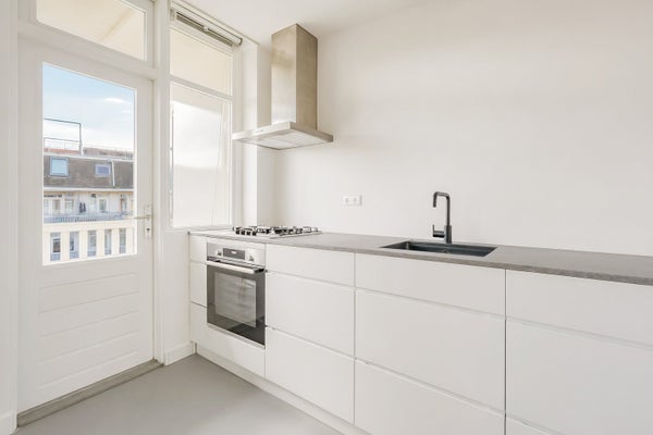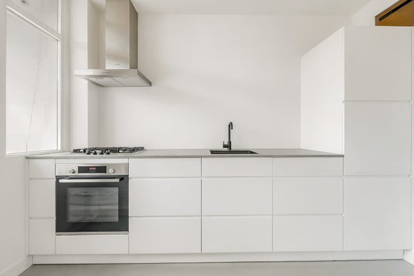 De witte keuken is voorzien van een betonnen aanrechtblad, gasfornuis en oven. Via de schuifpui bereikt u het zonnige balkon, vanwaar u uitkijkt op de gracht en de historische gebouwen aan de overkant.
