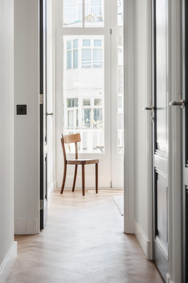 De hal, voorzien van een stalen deur tot aan het plafond, geeft toegang tot de lichte woon-/eetkamer. Hier zorgen de grote raampartijen voor overvloedig daglicht en een ruimtelijk gevoel. De eikenhouten visgraatvloer en sfeervolle gashaard creëren een warme, stijlvolle ambiance. Aan de woonkamer grenst een balkon waar u kunt genieten van de zon en het uitzicht over de charmante Van Breestraat.