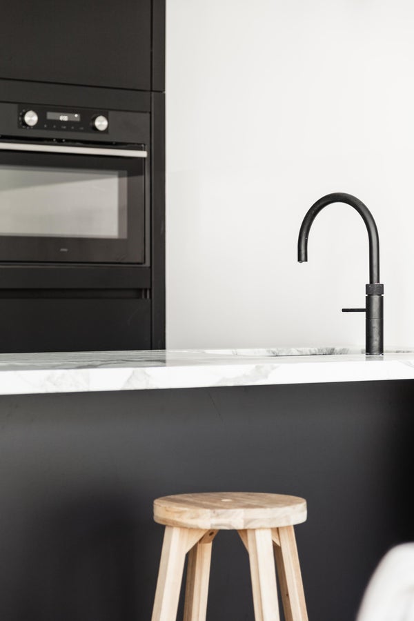 De op maat gemaakte keuken is uitgerust met hoogwaardige inbouwapparatuur, waaronder een inductiekookplaat, combi-oven, Quooker en vaatwasser. Het royale kookeiland met Italiaans marmeren blad maakt deze ruimte een genot voor kookliefhebbers.